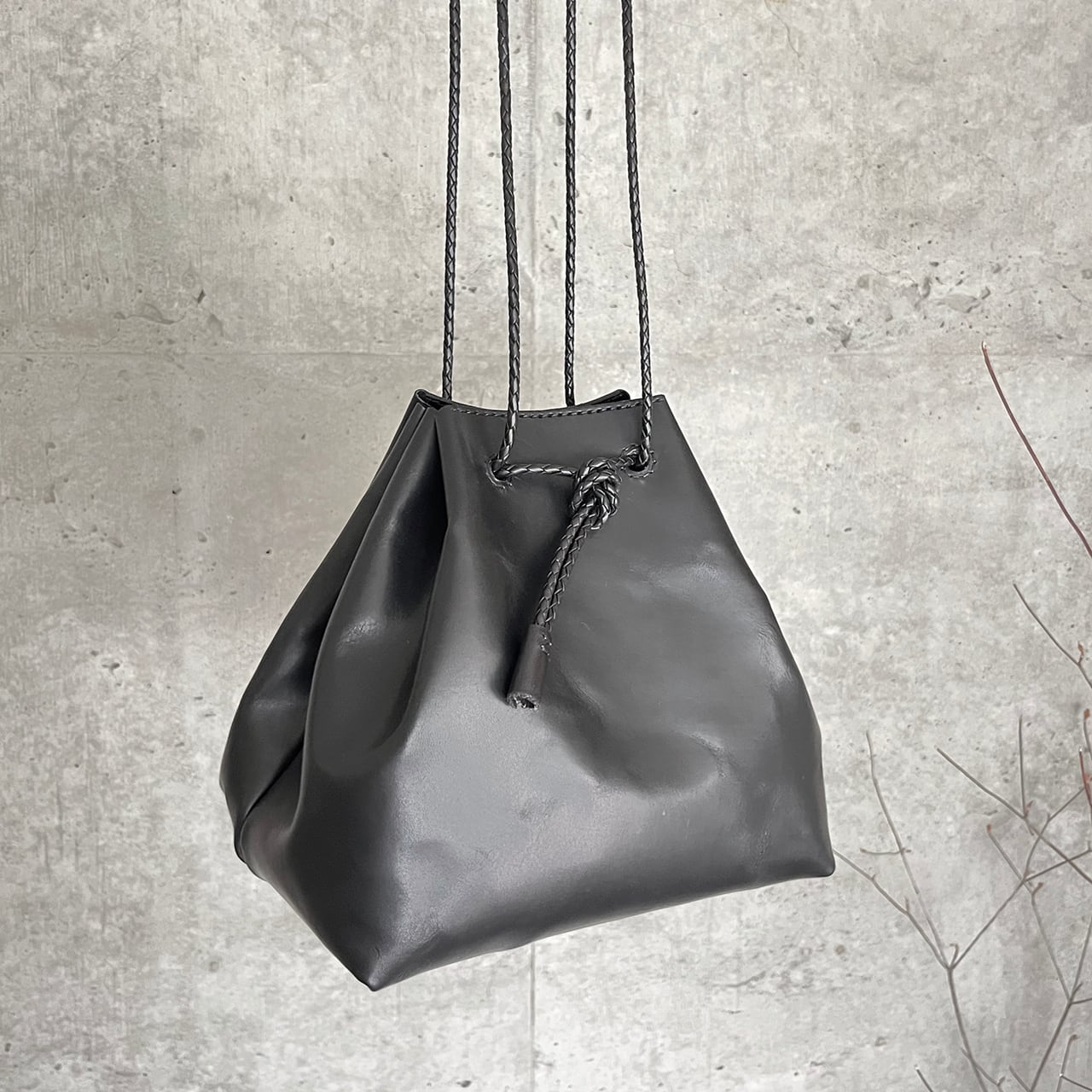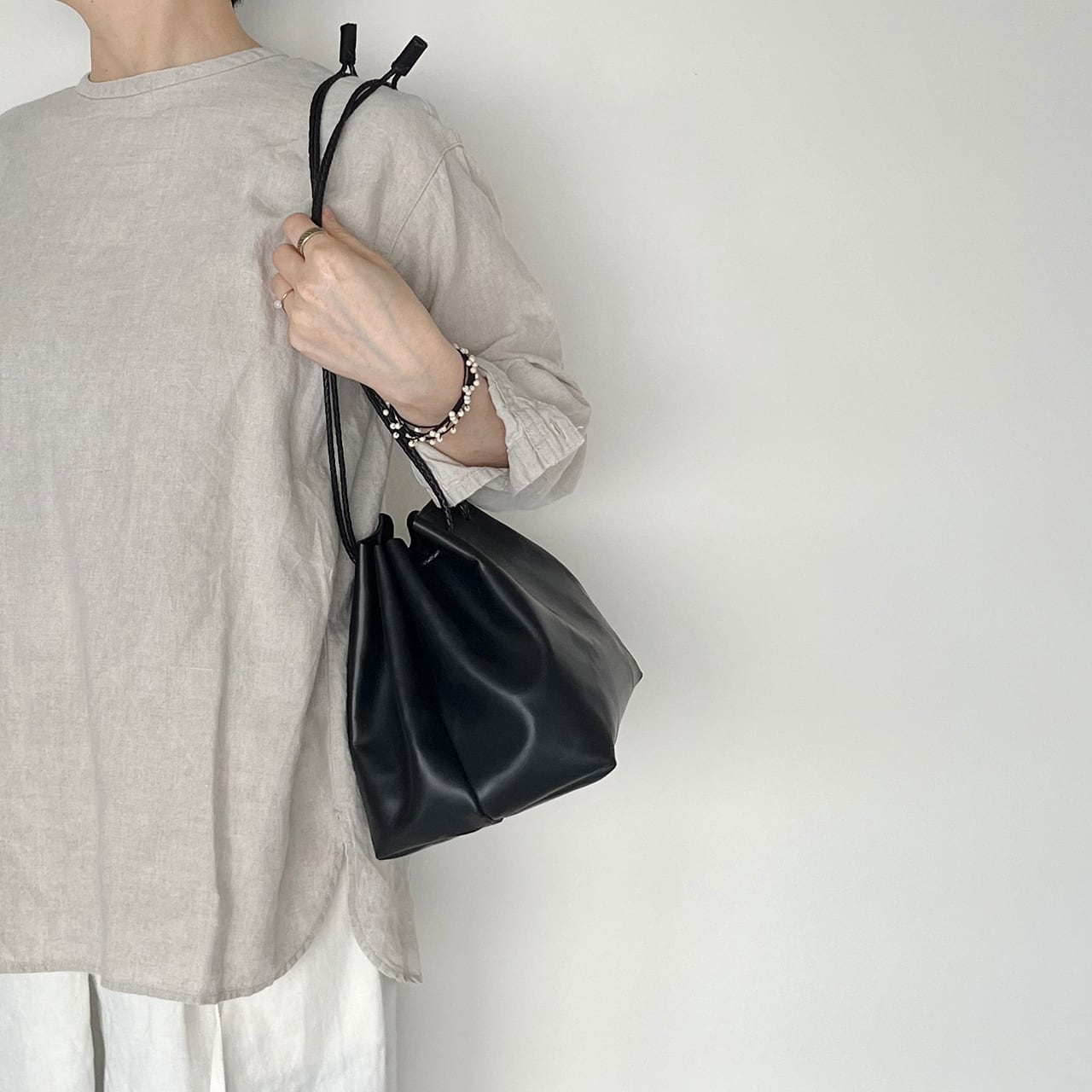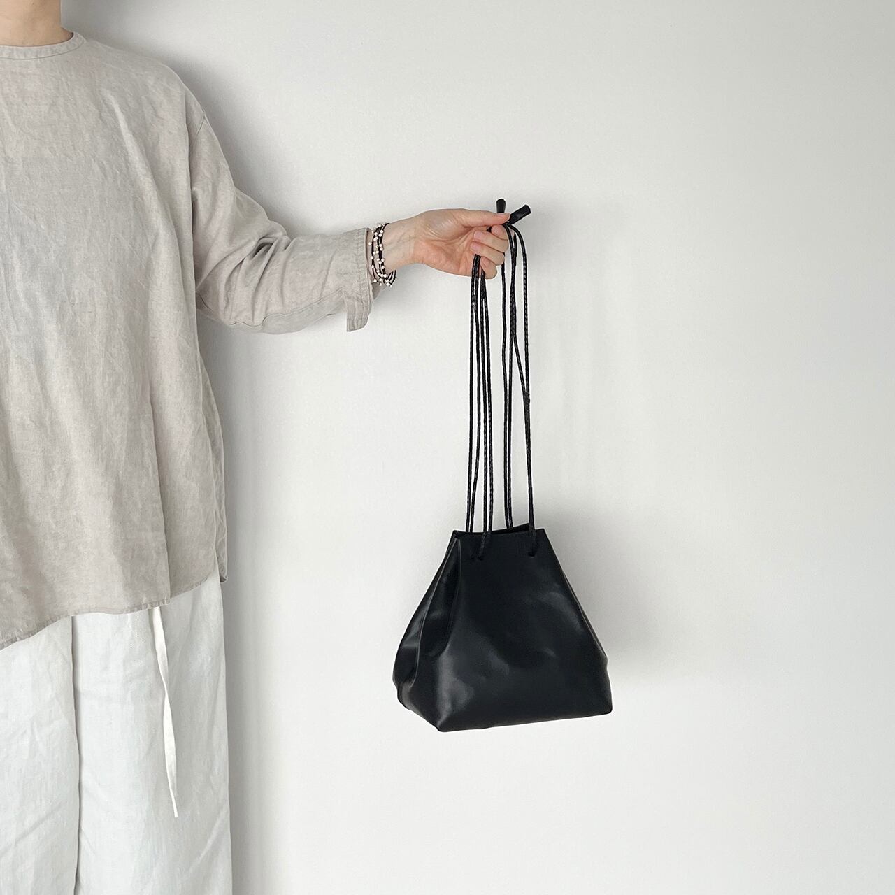 甘さを抑え、すっきりシンプルな四角い巾着ポシェットです。