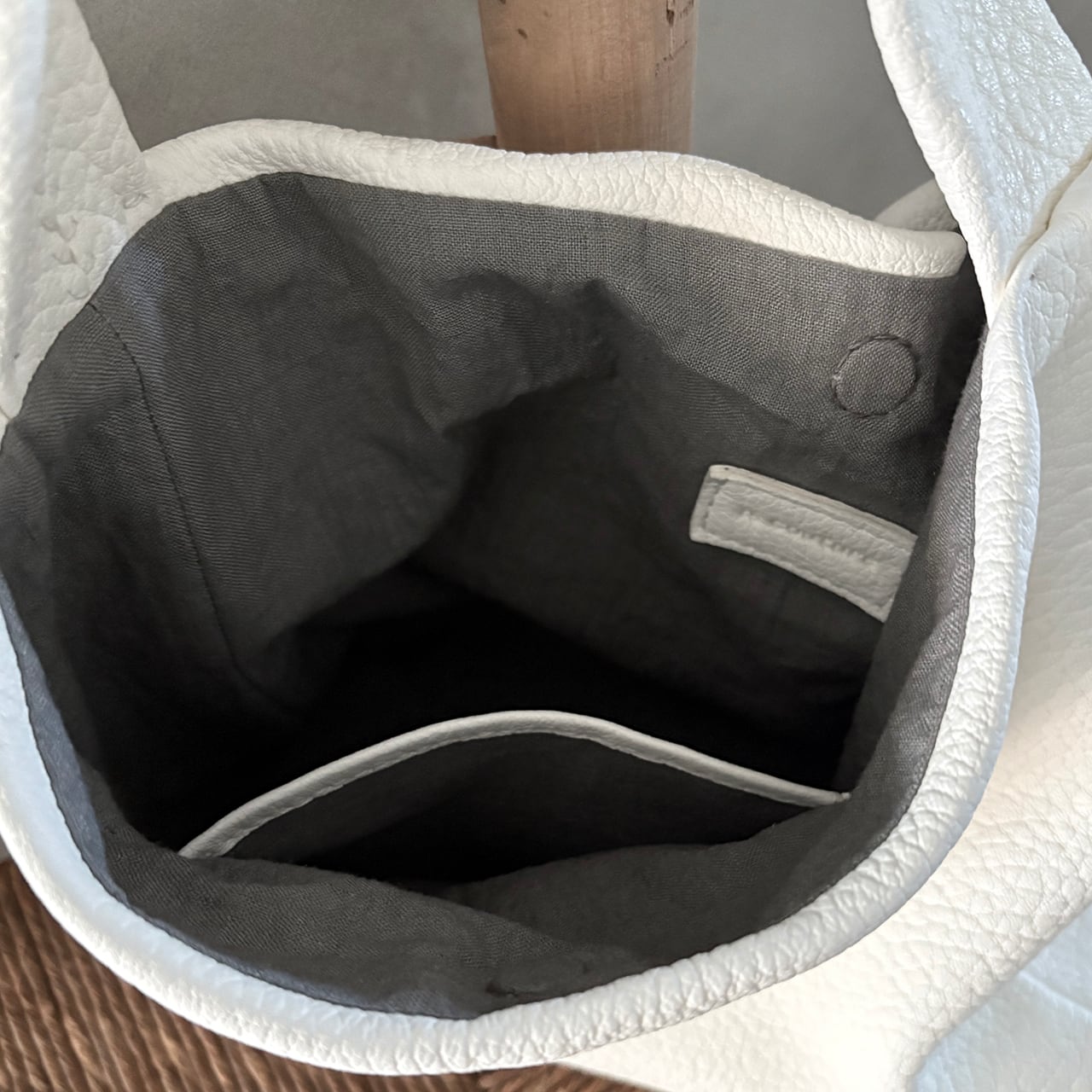 国産リネン100%の内布とポケットが付き、表のステッチを無くすことで