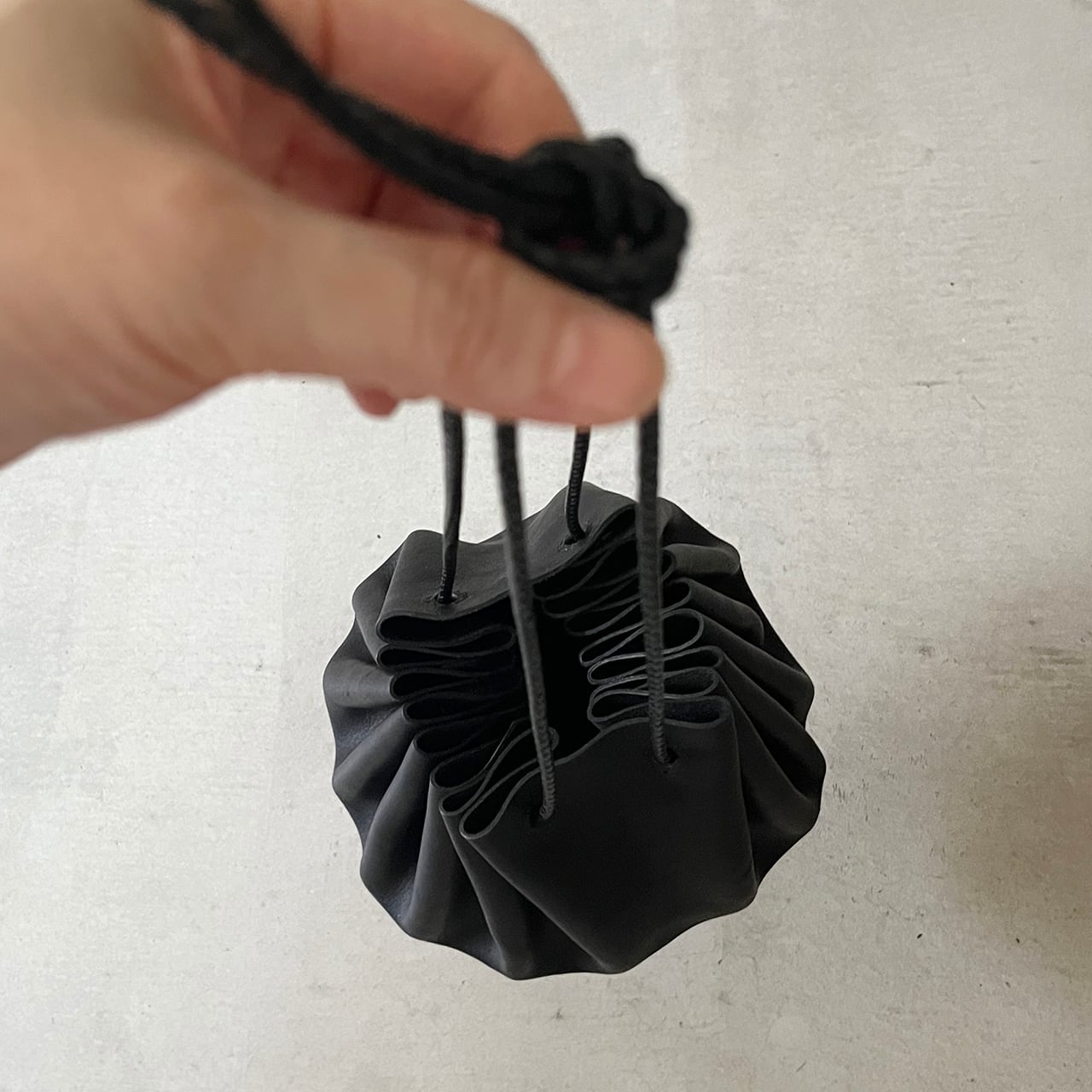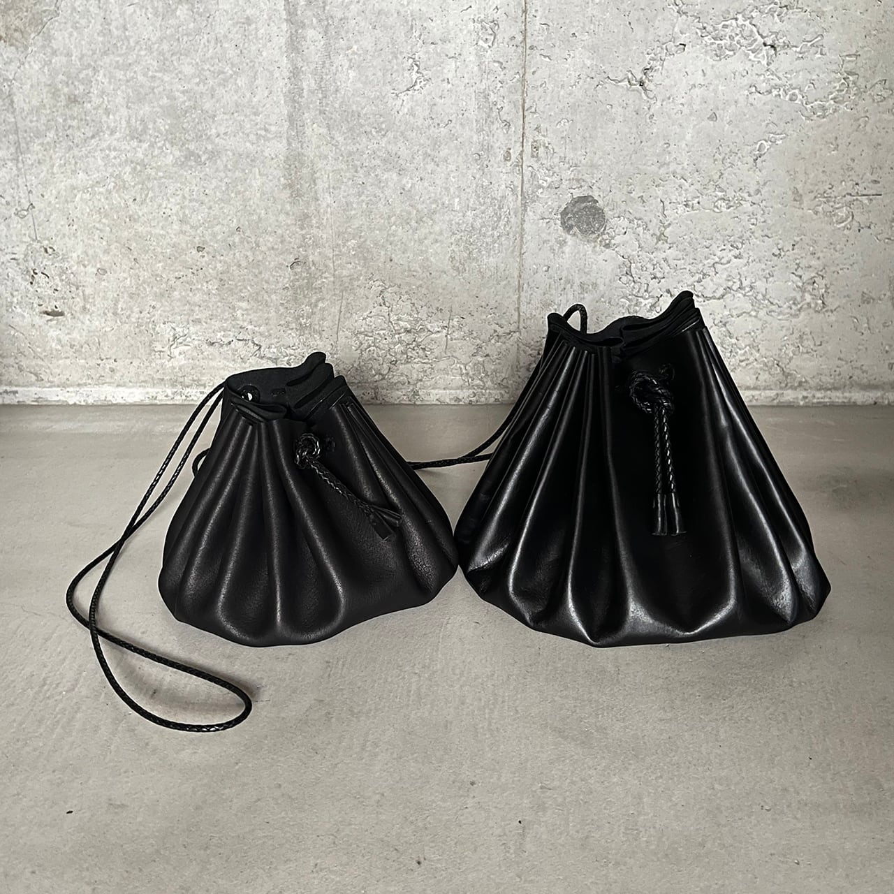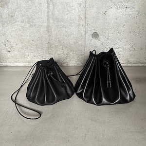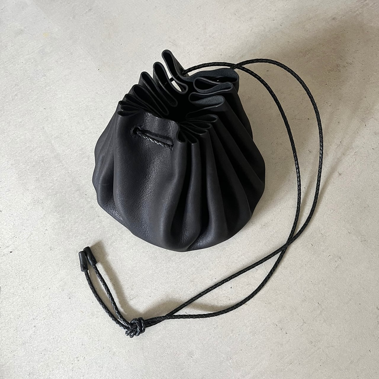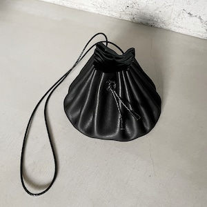 フルタンニンレザーを接ぎ合わせなしで巾着にしました。