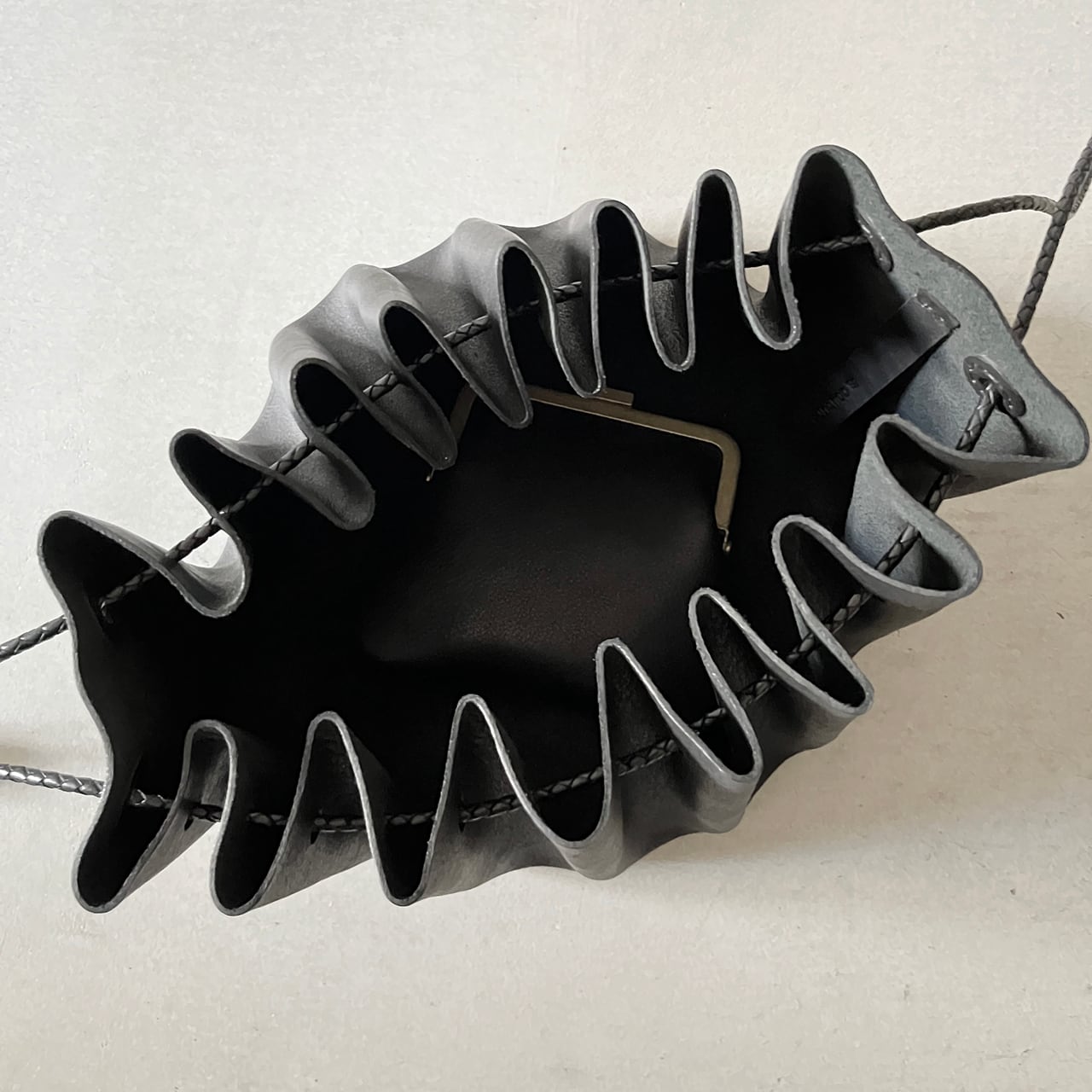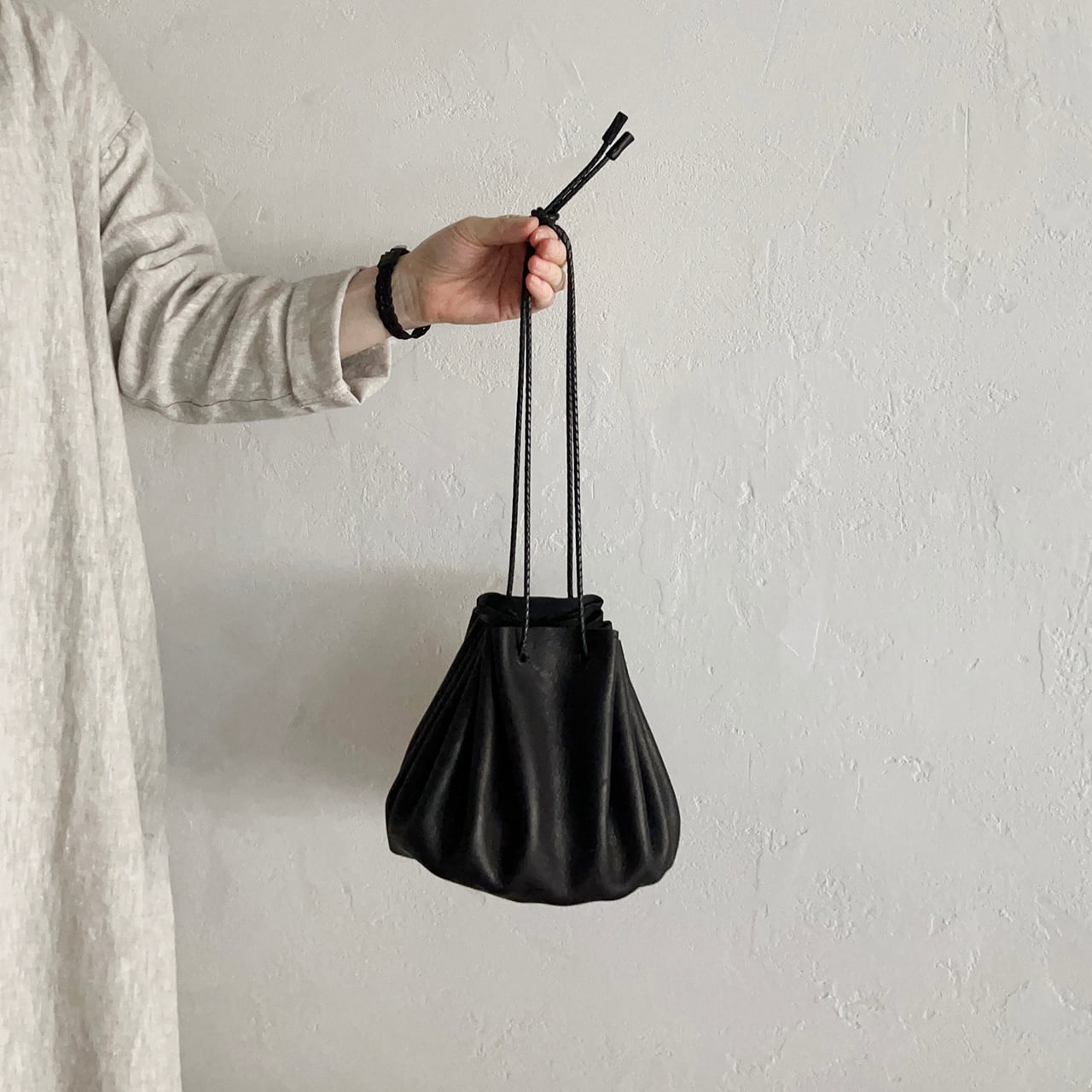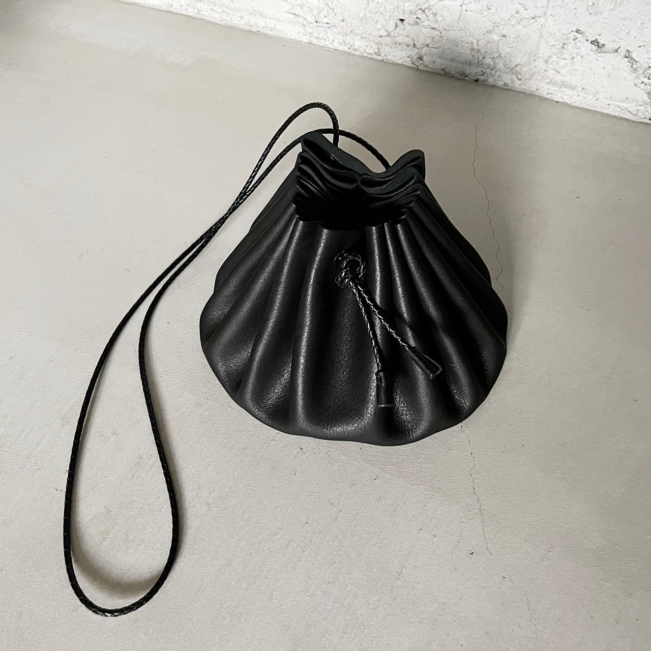 長い牛革の四つ編み紐で斜めがけも可能です。