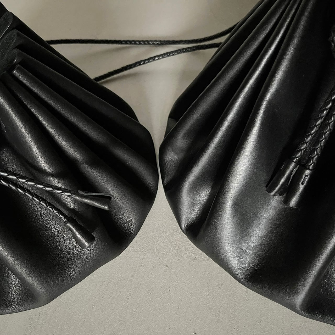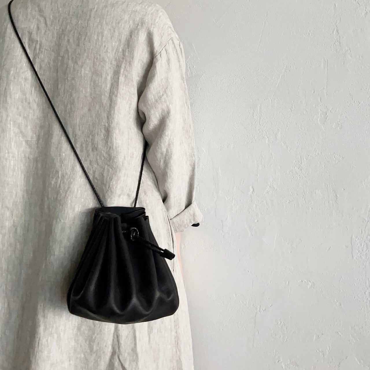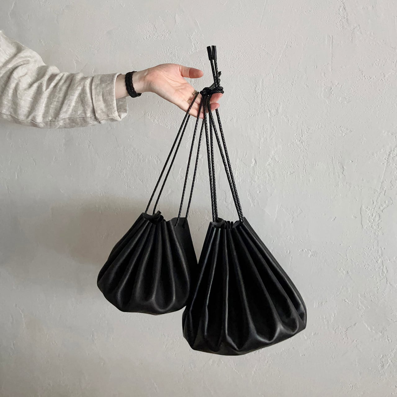 長い牛革の四つ編み紐で斜めがけも可能です。